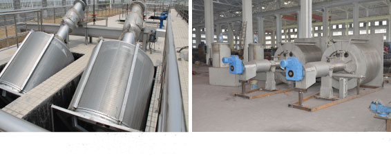 該設(shè)備采用轉(zhuǎn)鼓螺旋式,由圓形篩筒作為柵面,與水平面成35°安裝在水渠中,當(dāng)污水從格柵端頭流入篩筒內(nèi),大于柵隙的濾渣被攔截,沉積在篩筒內(nèi)表面,整個(gè)篩筒由電機(jī)驅(qū)動(dòng)旋轉(zhuǎn),篩筒上方的清渣刷與沖水機(jī)構(gòu)對篩面進(jìn)行清洗,將濾渣沖落入中央物料槽內(nèi),由輸送螺桿提升,經(jīng)壓榨、脫水后,由卸料口落入物料箱或輸送機(jī)進(jìn)行外運(yùn)處理。
